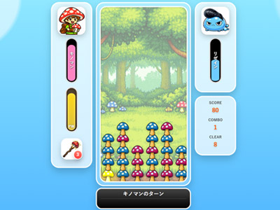 キノコを積み上げて揃えて消すパズルバトルゲーム。 連鎖コンボで敵にダメージを与えて勝利を目指そう。 戦略と爽快感がクセになるカジュアルゲーム!